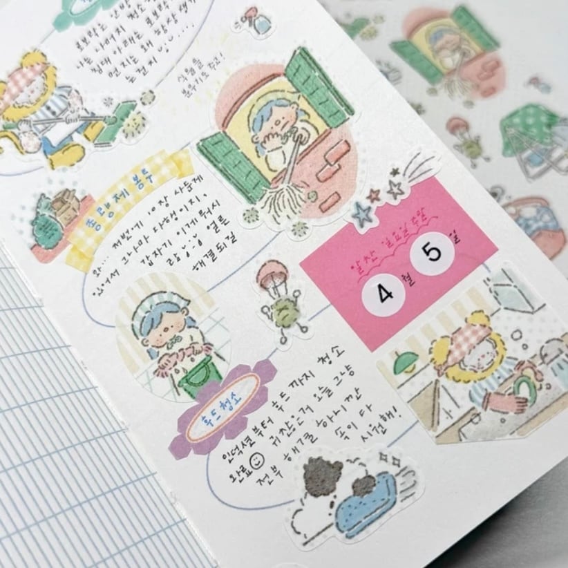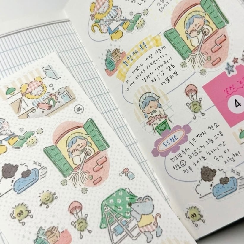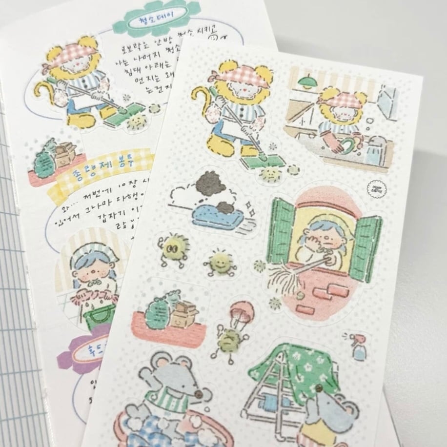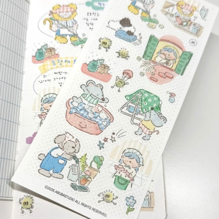 新作ステッカーです! お掃除をするキャラクターが可愛いです♡ 商品名:먼지 탈출 청소 시간 サイズ:74 x 174mm 素材:模造紙 ※ご注文の数量により、発送が複数に分かれる場合がございますのでご了承くださいませ。送料の追加はありません。